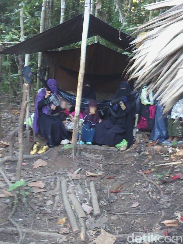 Dari foto yang didapatkan detikcom dari Satuan Tugas Tinombala gabungan Tentara Nasional Indonesia dan Kepolisian RI, nampak tiga perempuan bercadar hitam tengah berada dalam sebuah tenda. Ketiganya menenteng senjata laras panjang. Terlihat juga dua anak kecil di antara tiga perempuan itu.