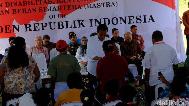 Presiden Jokowi saat membagikan bantuan pemerintah pusat kepada warga Manokwari, Papua Barat, Selasa (5/4/2016). Foto: Ikhwanul Khabibi/detikcom |