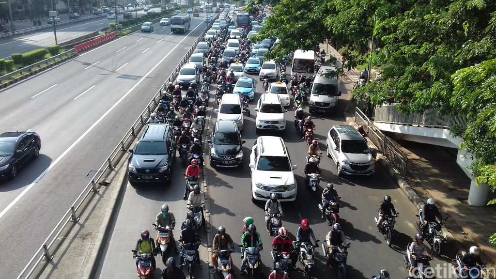 Jl Gatot Subroto menuju Semanggi cenderung padat (Foto: Nathania Riris Michico/detikcom) |