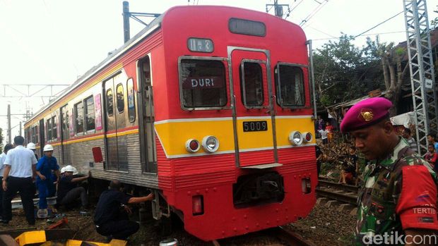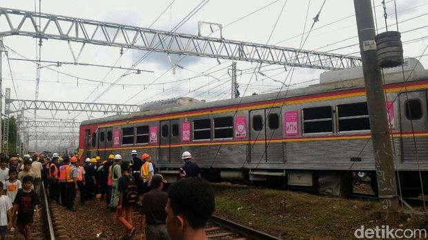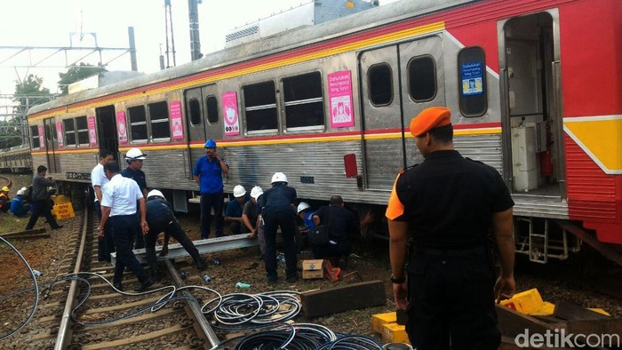 Berdasarkan pantauan detikcom dari lokasi, Rabu (6/4/2016) sekitar pukul 17.00 WIB, satu gerbong paling depan atau gerbong wanita tampak keluar jalur ke sebelah kiri. Sudah tak ada penumpang di gerbong tersebut.