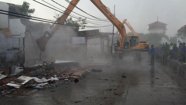 Pantauan di depan Museum Bahari pada pukul 07.15 WIB, Senin (11/4/2016) dari tiga alat berat yang ada, dua diantaranya sudah dikerahkan masuk ke dalam kawasan pasar. Hujan yang mengguyur kawasan itu tidak menyurutkan niat Pemprov untuk melakukan penertiban.