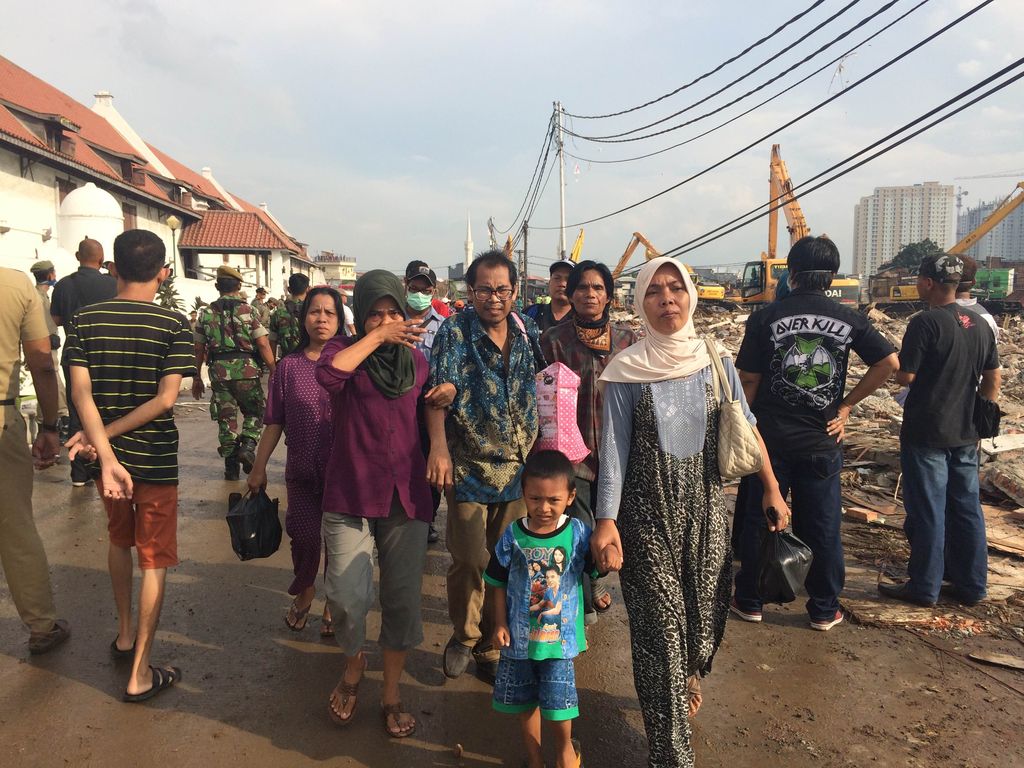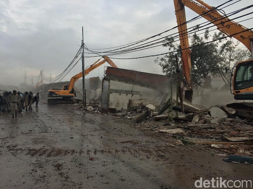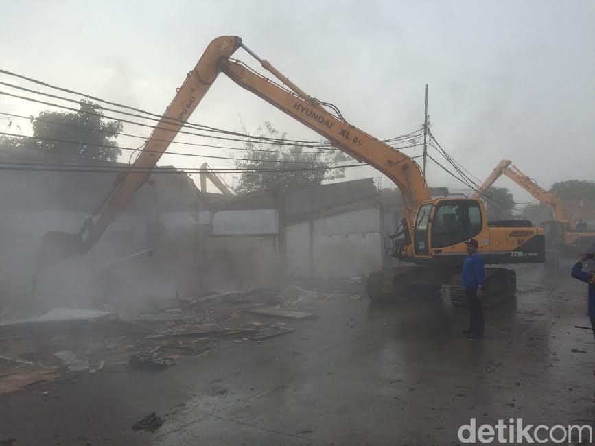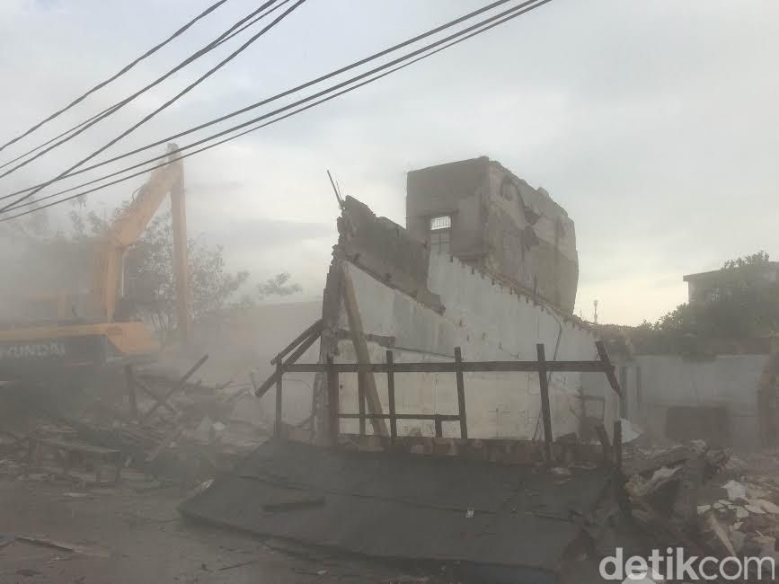 Alat berat bergerak menghantam bangunan yang masih berdiri. Satu persatu bangunan rata dengan tanah.