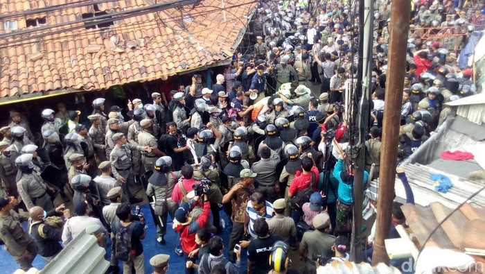 Satpol PP pun berlindung di balik tameng yang dibawa. Polisi juga menghindar ke balik dinding. Tak lama kemudian, petugas Satpol PP mulai masuk ke antara lorong.