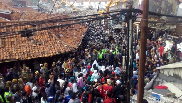 Aksi penolakan masih dilancarkan lewat pelemparan kayu dan batu dari arah lorong di antara kios. Warga melempar ke arah petugas.