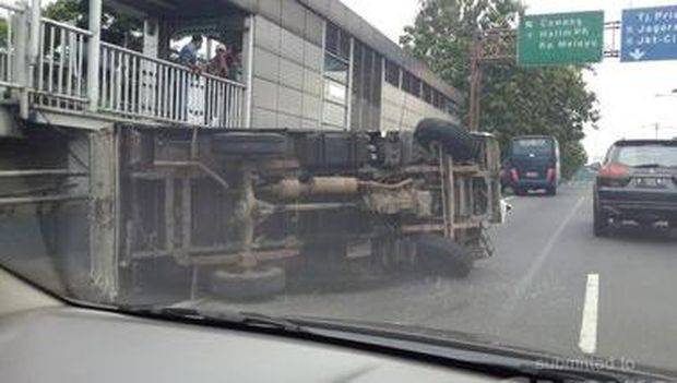 Laporan dari kontributor pasangmata.com, Fadli, Selasa (12/4/2016), pukul 10.00 WIB, truk tersebut terguling dekat halte busway. Terlihat kerusakan di bagian tembok pembatas. Posisi truk terguling ke bahu jalan sebelah kiri. Kaca depannya hancur.