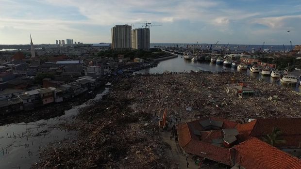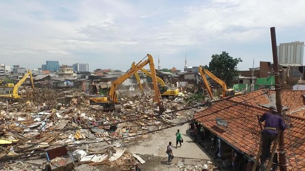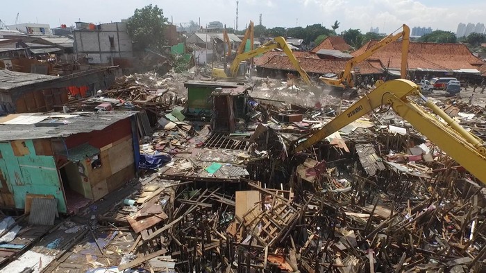 Pantauan detikcom dari udara, Selasa (12/4/2016) alat-alat berat milik Dinas Tata Air (DTA) DKI mengepung kawasan Kampung Luar Batang. Mereka menghancurkan bangunan ilegal dan mengangkut puing ke atas truk.