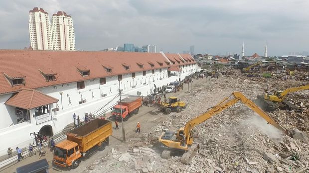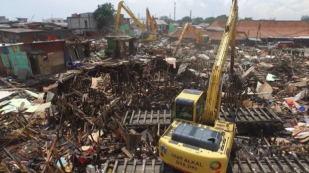 Puing bangunan itu dipindah ke truk yang telah disediakan Dinas Kebersihan DKI. Selain mengangkut sisa kayu dan besi, ada juga alat berat yang bertugas mengeruk lumpur di Kali Krukut yang letaknya tidak jauh dari Pasar Ikan.