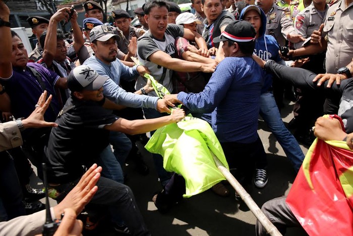 Di lokasi, Senin (18/4/2016),Β massa pendemo kemudian bergeser ke arah Stasiun Gambir.Β Mereka membawa spanduk yang menyatakan simposium tersebut bertentangan dengan Pancasila.