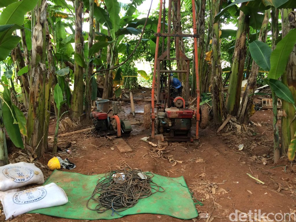 Sebuah mesin berwarna merah yang belum diketahui fungsinya tergeletak begitu saja di tengah-tengah kebun yang telah dibobol. Di sebelahnya tampak sebuah genset, satu helm proyek berwarna biru, terpal dan celana jins berukuran pendek.