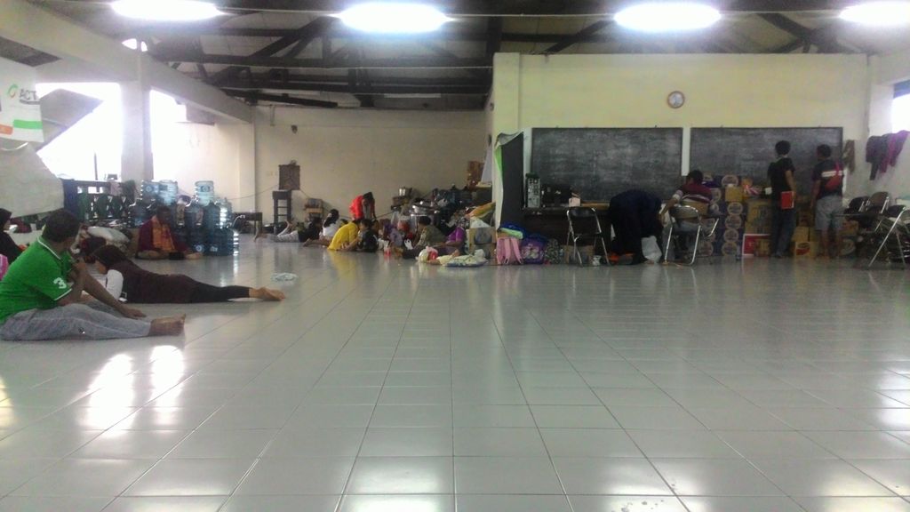 Barang-barang mereka yang dimasukkan dalam dus yang ditumpuk-tumpuk diletakkan di pinggir aula. Beberapa galon air mineral juga diletakkan di tempat yang tidak jauh dari kardus-kardus.