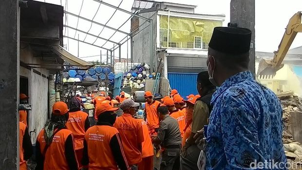 Keberadaan bangunan-bangunan itu dinilai membuat macet dan mengganggu jalur hijau. Di lokasi, petugas Satpol PP, TNI, dan Kepolisian berjaga.