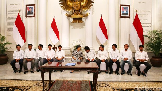 Menlu Retno Marsudi saat menyerahkan 10 WNI yang disandera Abu Sayyaf ke pihak keluarga di Gedung Pancasila, Kemlu, Jakarta (2/5/2016). (Ari Saputra/detikcom) |
