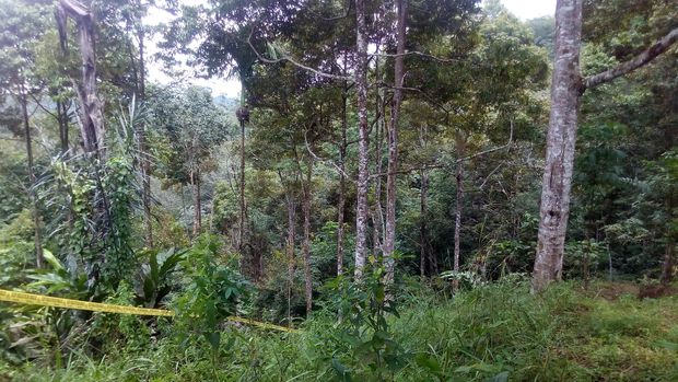 Di lokasi kejadian, garis polisi masih terpasang. Selain pepohonan, ilalang tumbuh mengisi pohon-pohon yang posisinya berjarak.