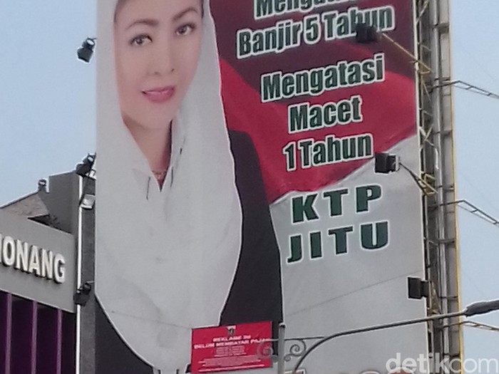 Reklame itu sendiri bertuliskan, "Hj. Hasnaeni, SE, MM, Pro Rakyat, Mengubah Sampah Jadi Emas. Mengatasi Banjir 5 Tahun,Β Mengatasi Macet 1 tahun, KTP jitu. Wanita Emas".