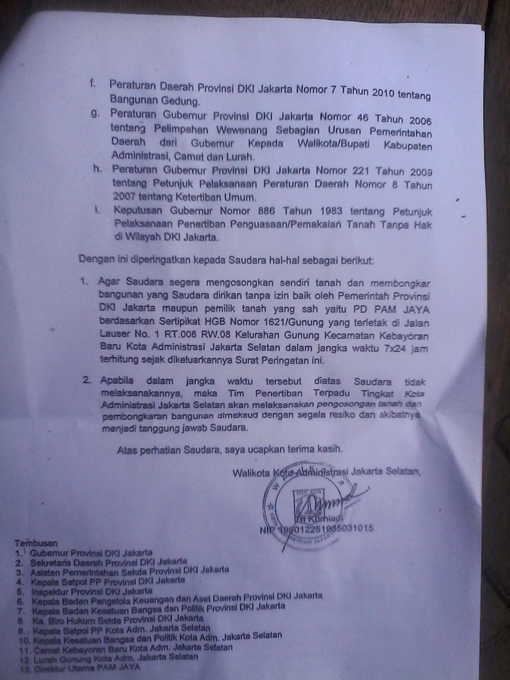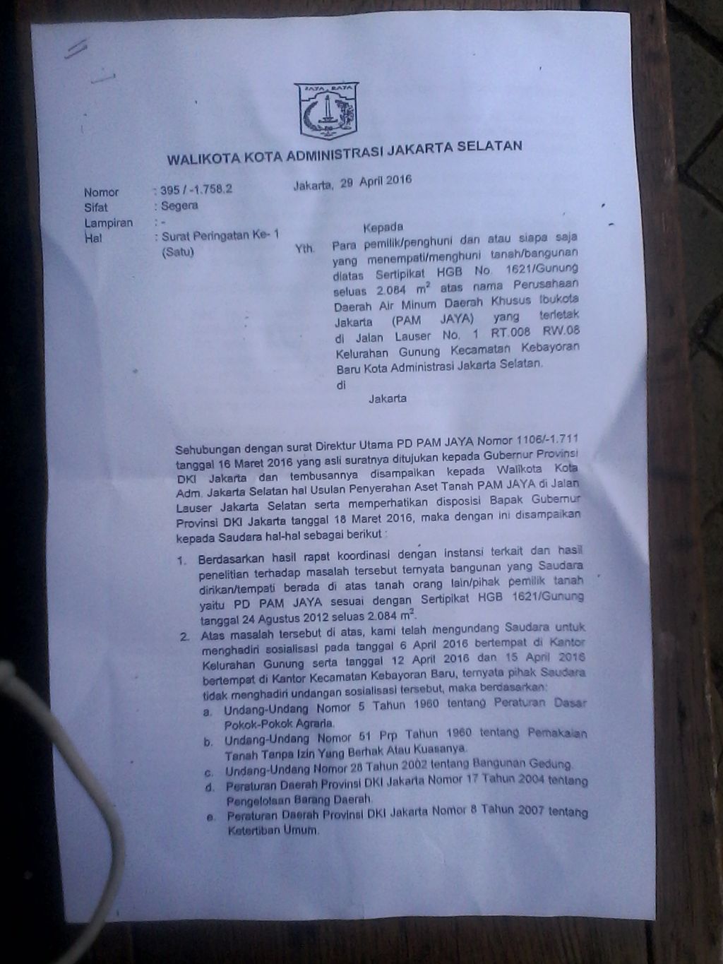 Seperti diberitakan sebelumnya, dalam SP-1 Wali Kota Jakarta Selatan Tri Kurniadi tertulis warga Jalan Lauser Nomor 1 RT 8 RW 8 menempati lahan di atas sertifikat HGB nomor 1621/Gunung seluas 2.084 m2 atas nama Perusahaan Daerah Air Minum Daerah Khusus Ibu Kota Jakarta (PAM Jaya) pada 24 Agustus 2012. Surat tersebut ditembuskan kepada Gubernur DKI Basuki Tjahaja Purnama (Ahok).
