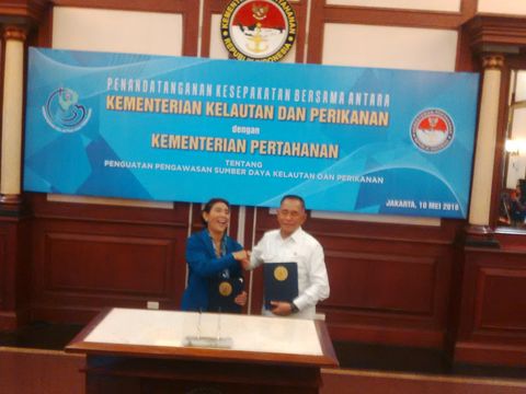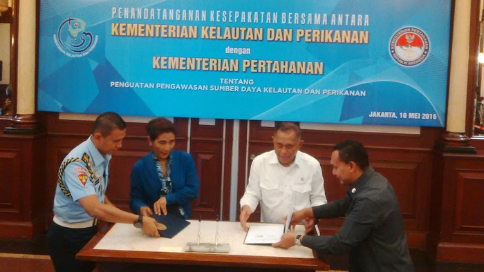 Penandatanganan naskah kesepakatan bersama ini ditandatangani Menteri Pertahanan Ryamizard Ryacudu dan Menteri Kelautan dan Perikanan Susi Pudjiastuti di aula Bhinneka Tunggal Ika Gedung Kementerian Pertahanan, Jl Medan Merdeka Barat, Jakarta Pusat, Selasa (10/5/2016).