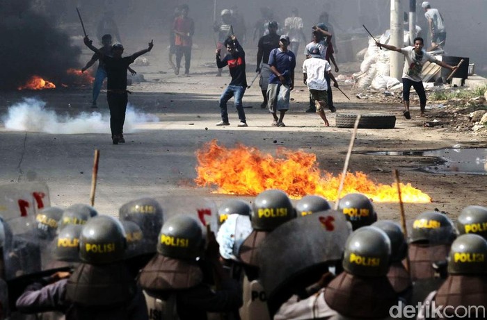 Setelah sempat terhenti, warga kembali menyerang petugas dengan lemparan batu. Polisi pun menembakkan gas air mata untuk memecah belah massa.