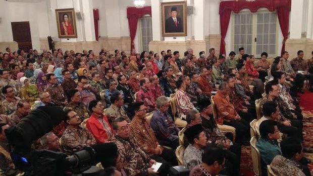 Para gubernur se-Indonesia ini dikumpulkan di ruang utama Istana Negara, Jakarta Pusat, Rabu (11/5/2016). Wakil Presiden Jusuf Kalla (JK) turut mendamping Presiden Jokowi dalam acara ini.