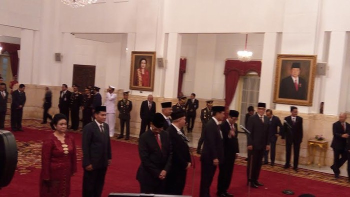 Pelantikan dimulai pukul 16.30 WIB. Setelah lagu kebangsaan Indonesia Raya dikumandangkan, Presiden Jokowi langsung mengambil sumpah dan janji para komisioner yang dilantik.