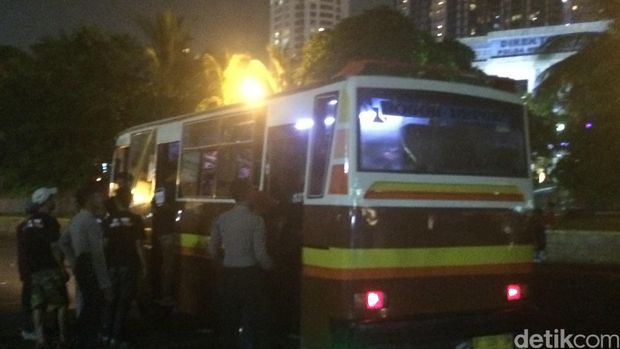 Polisi melakukan penyekatan kendaraan di depan Mako Polda Metro Jaya di Jl Gator Subroto. Sejumlah kendaraan baik bus, angkot hingga motor yang ditumpangi para suporter digiring ke dalam markas.