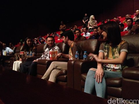 Lokasi nonton bareng ini berada di XXI Epicentrum, Jl Rasuna Said, Kuningan, Jakarta Selatan, Kamis (19/5/2016). Ahok terlihat mengenakan kemeja batik warna biru dan duduk di bagian tengah.