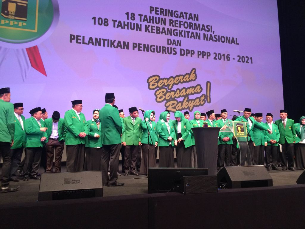 Para pengurus PPP yang dilantik diminta ke panggung, lalu dilantik oleh Ketum PPP Romahurmuziy, yang terpilih dalam Muktamar VIII di Asrama Haji, Jakarta, 9 April lalu.