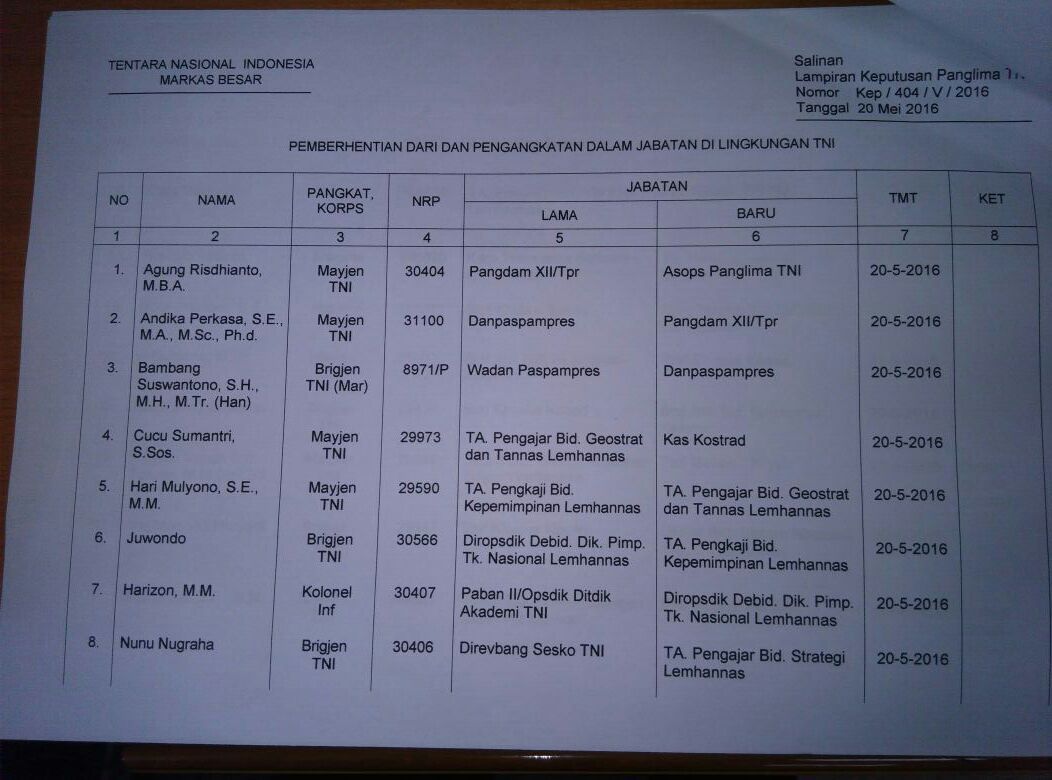 Dari Surat Keputusan yang beredar, Sabtu (21/5/2016), Andika akan menempati posisi Pangdam Tanjungpura menggantikan Mayjen TNI Agung Risdhianto. Sementara, posisi Danpaspampres akan diisi Brigjen TNI Bambang Suswantono yang sebelumnya menjabat sebagai Wadan Paspampres.