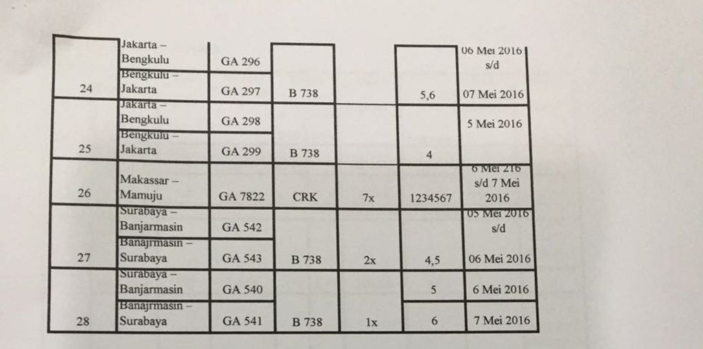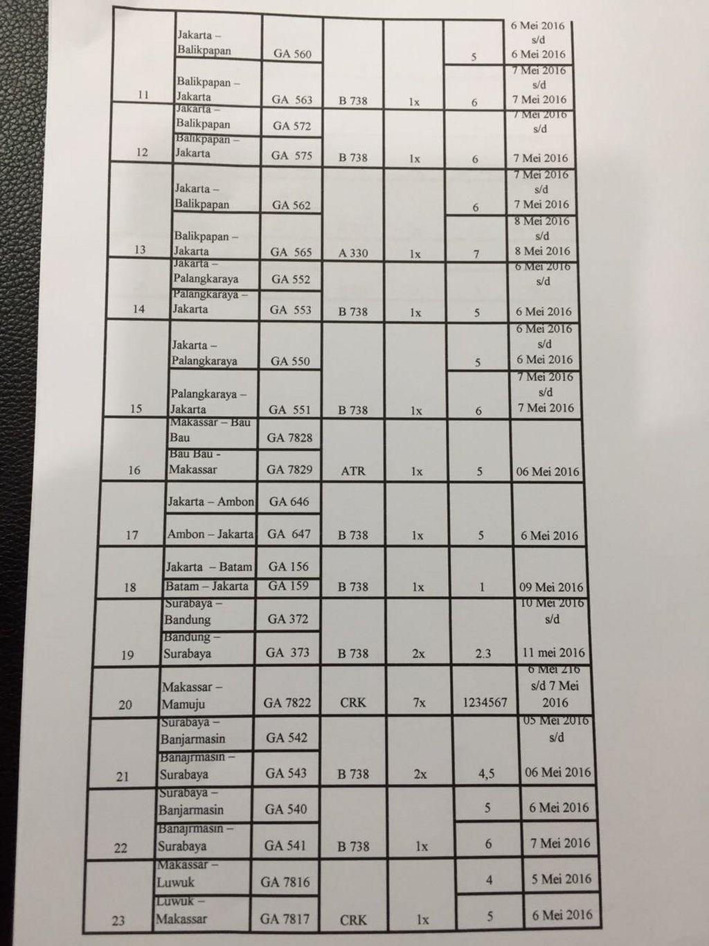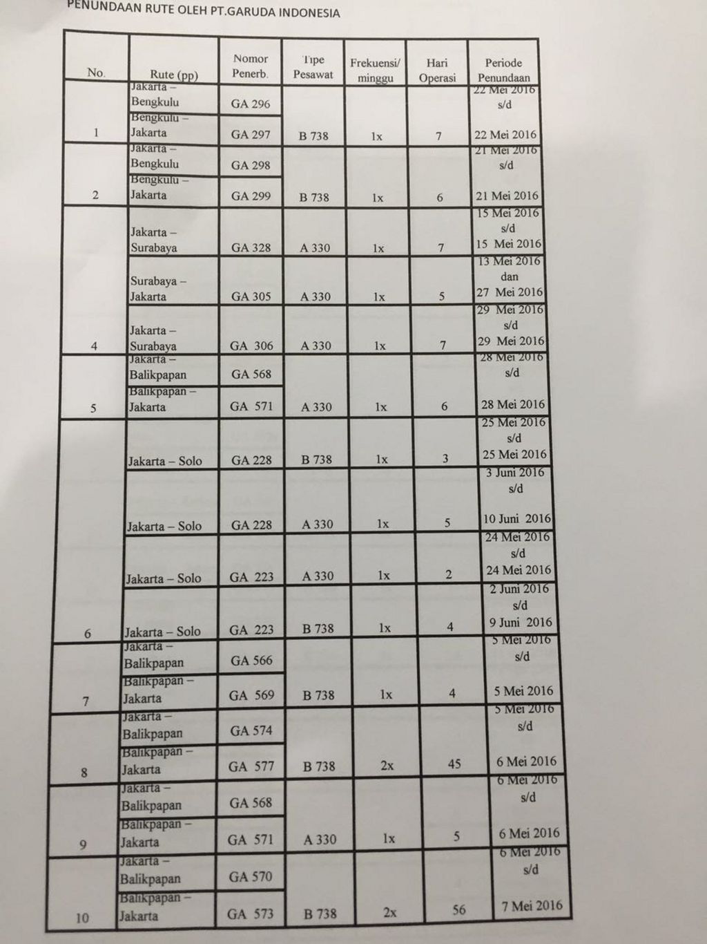 1. Garuda Indonesia mengajukan pengurangan frekuensi penerbangan antara 6 Mei-9 Juni 2016 dengan rute: