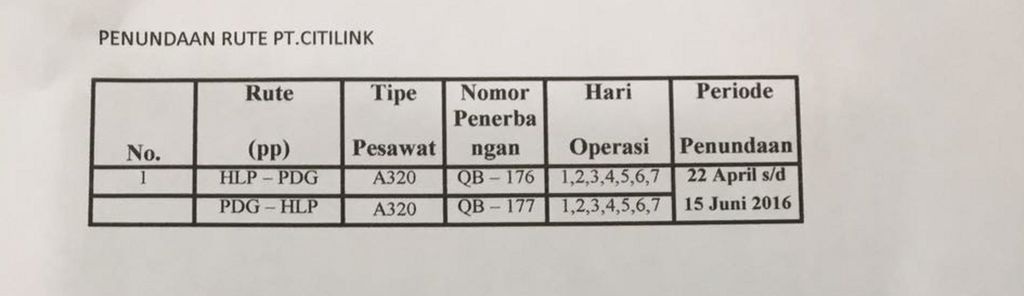 2. Citilink mengajukan pengurangan frekuensi penerbangan antara 22 April-15 Juni 2016 dengan rute: