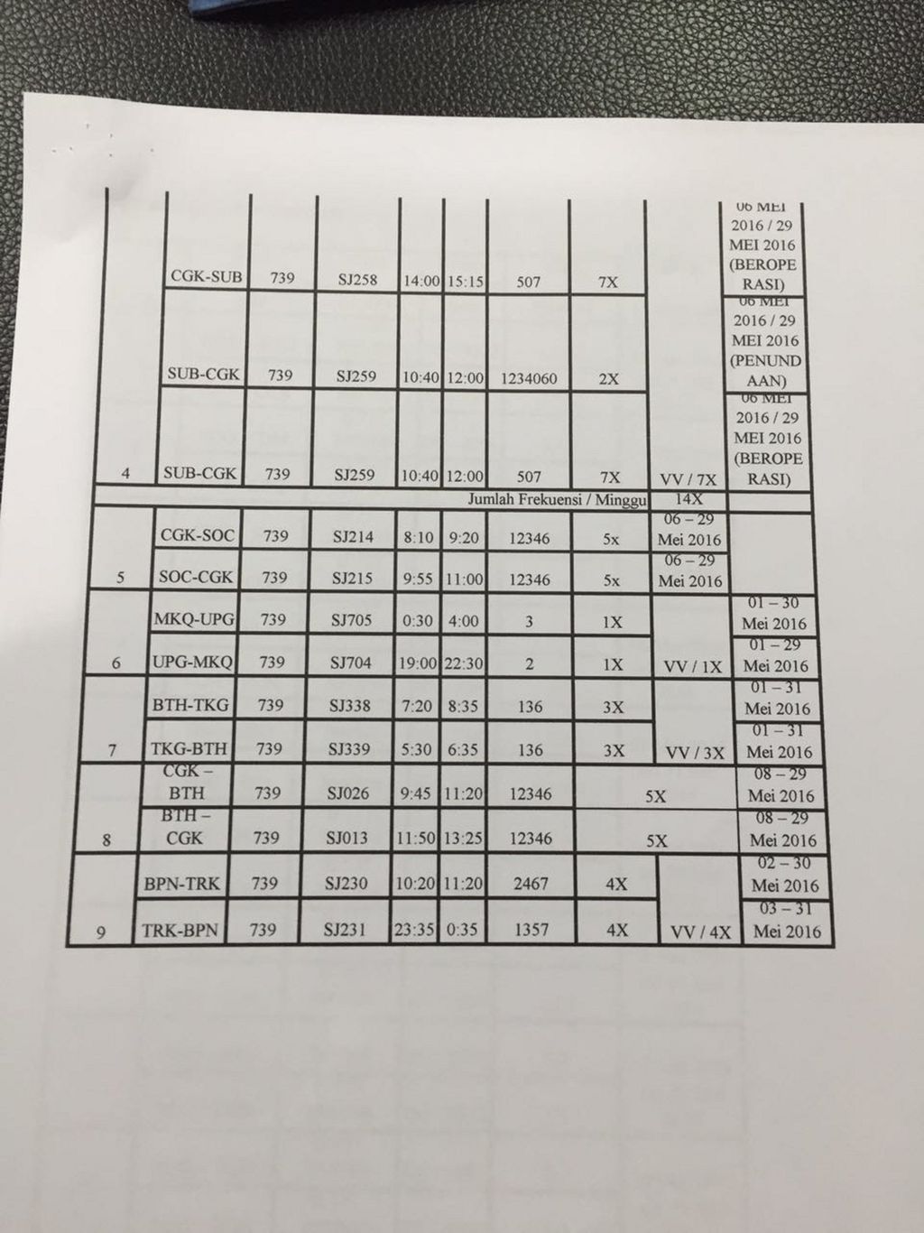 4. Nam Air mengajukan pengurangan frekuensi penerbangan antara 3 Mei-2 Juni 2016 dengan rute: