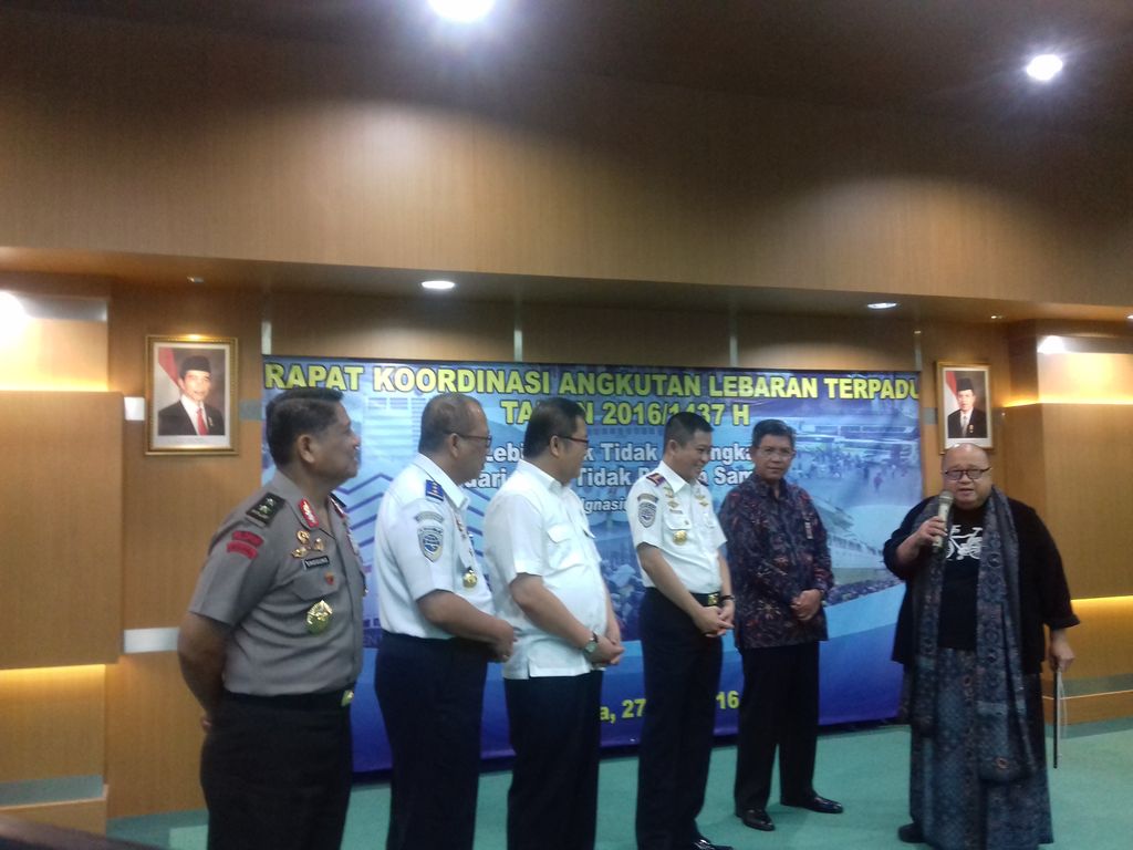 Pemberian penghargaan dilakukan oleh Ketua Umum MURI Jaya Suprana di Kemenhub, Medan Merdeka Barat, Jakarta Pusat, Jumat (27/5/2016). Penghargaan diberikan sebelum Rapat Koordinasi Angkutan Lebaran 2016 yang diikuti oleh Menkominfo Rudiantara, Asisten Kapolri Bidang Operasi Irjen Unggung Cahyono dan Direktur Jenderal Perhubungan Darat Kemenhub Pudji Hartanto.