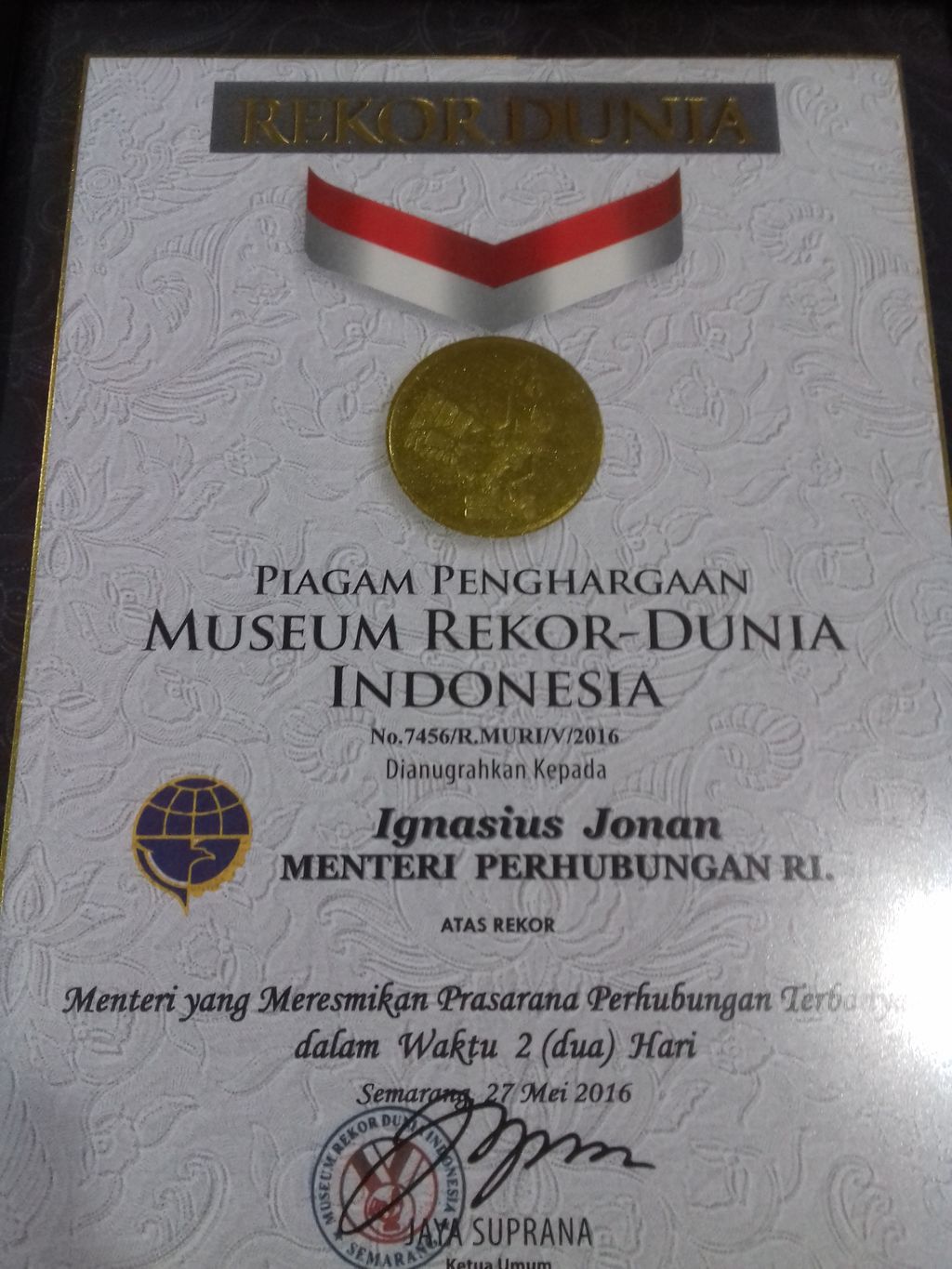 "MURI memberikan penghargaan ini ke Bapak Menteri Perhubungan dan Kementerian Perhubungan karena memberikan kinerja yang baik bisa meresmikan prasarana terbanyak dalam waktu dua hari. Ini tidak ada di negara manapun," kata Jaya.