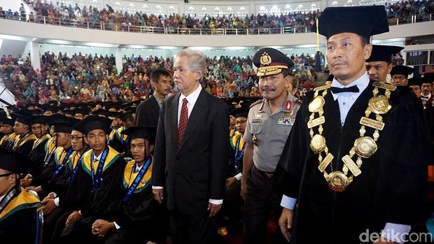 Selepas orasi, Jenderal Badrodin dikukuhkan sebagai keluarga kehormatan UMM melalui penyematan jas almamater oleh Ketua Badan Pembina UMM, Prof Abdul Malik Fadjar.