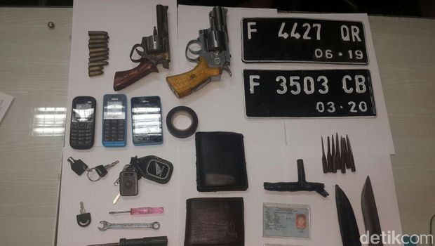 Dari para pelaku, polisi menyita 2 unit senjata api jenis revolver rakitan berikut 38 butir peluru, 1 buah kunci ketter T berikut 7 anak kuncinya, 1 unit motor Honda Vario Tecno bernopol Z 4327 YM yang merupakan hasil kejahatan.