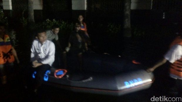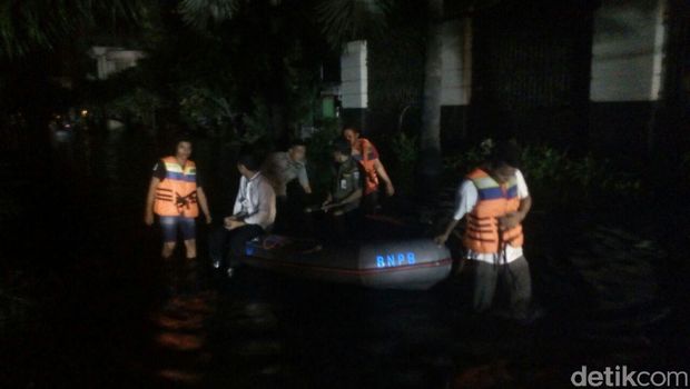 Selain itu, para petugas siaga bencana dari BPBD DKI Jakarta dan BNPB tampak menggunakan perahu karet mengelilingi kawasan.