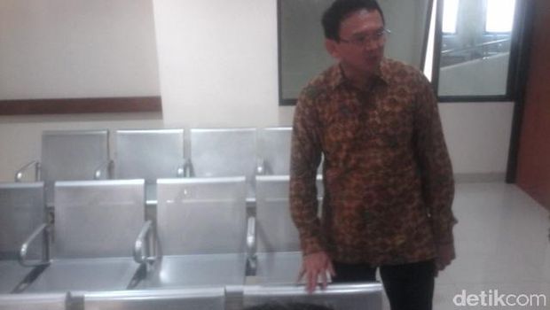 Ahok meninjau isi RSUK Taman Sari selama 15 menit. Dia juga menaruh perhatian khusus ke meja dan bangku di poliklinik.