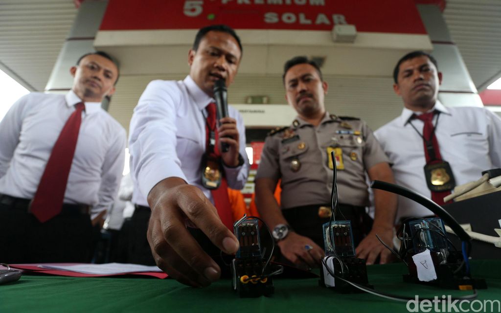 Polisi menunjukkan alat mengurangi takaran BBM (Grandy/detikom) |