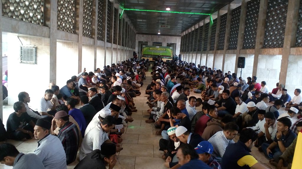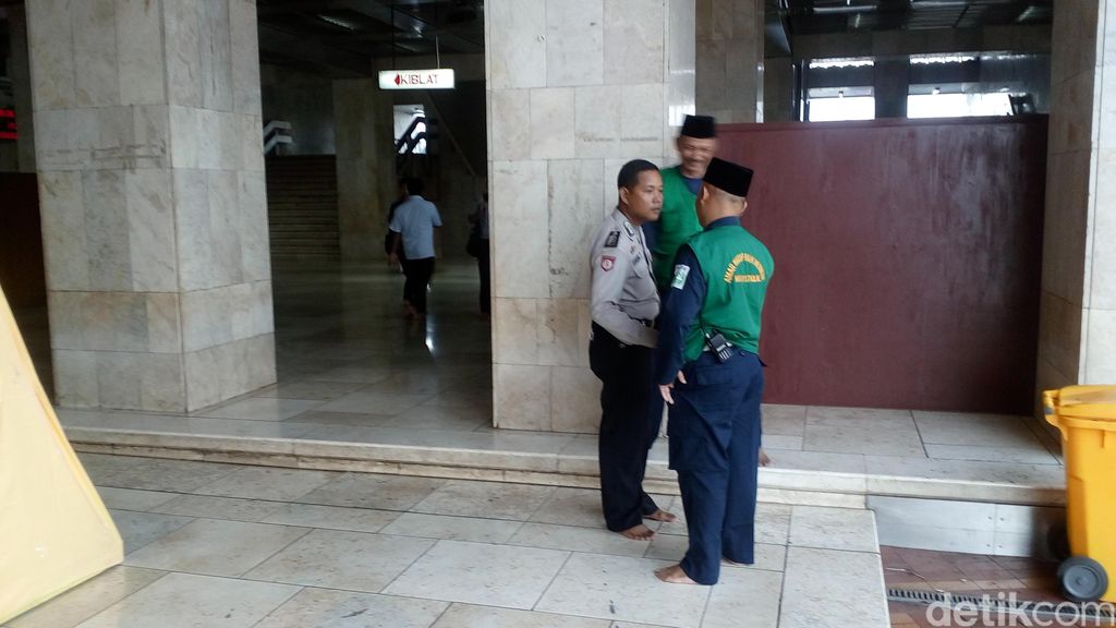 "Kami pada dasarnya ingin menjaga ketertiban. Tapi kami memberikan tempat di bagian selasar kanan dan kiri saja. Bagi ibu yang membawa balita di bawah umur 7 tahun disarankan masuk ke bagian belakang masjid," kata Wahyono.