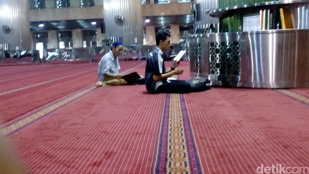 Sejumlah orang terlihat membaca Alquran dengan khusyuk di hall tempat ibadah di Masjid Istiqlal, Jl Taman Wijaya Kusuma, Jakarta Pusat, Senin (6/6/2016). Sebagian yang lain tiduran, ada juga yang memainkan ponselnya. Mereka yang tiduran disediakan tempat khusus di selasar kiri kanan masjid.