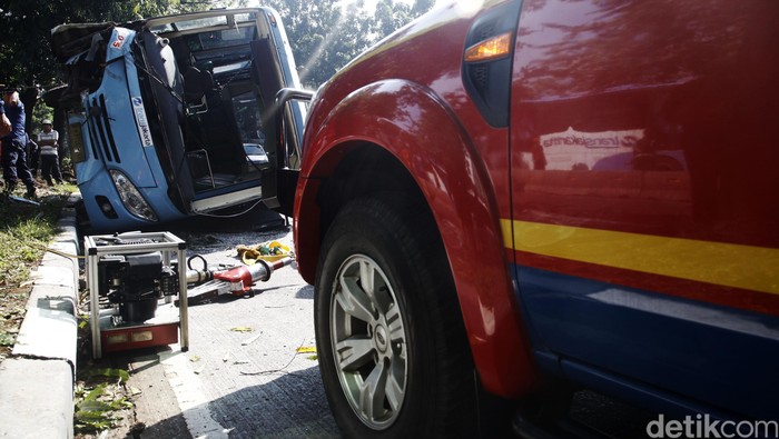 "Informasi dari petugas on board, bus KAJ 075 ini mengalami kecelakaan tunggal. Bus ukuran medium ini terbalik di jalur busway," terangnya.