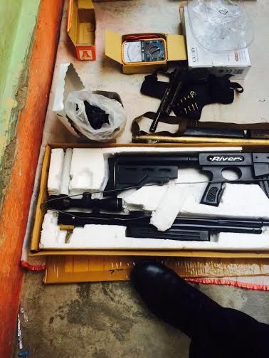 Dari rumah di Lebak Timur, Densus 88 menyita tiga buah bom, dua pucuk senjata api (senpi) laras panjang, satu pucuk pistol dengan empat peluru di dalamnya, dua kardus seperangkat komputer, satu unit laptop, sangkur, dan satu buah avo meter.