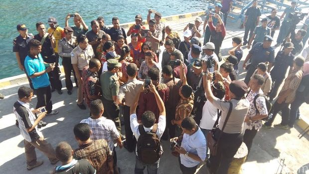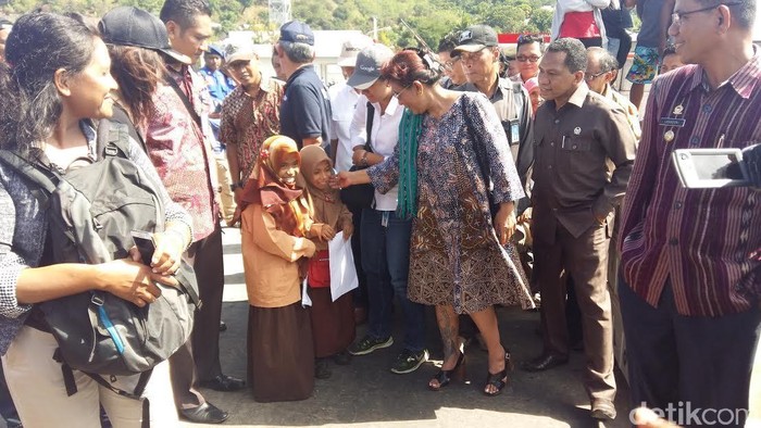 Turun dari KRI Untung Suropati, Susi langsung disambut pejabat daerah setempat, seperti Bupati Flores Timur (Flotim) Yoseph Lagadoni Herin. Dia disalami dan diberikan kain selendang sebagai ucapan selamat datang di Larantuka.