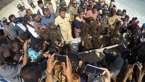 Di tepi pantai, Susi langsung dikerubungi kaum nelayan yang berebut menyalami dirinya. Susi pun diajak melihat rumput laut hasil budidaya nelayan setempat. Ketika itu Susi tampak dipeluk erat oleh seorang ibu nelayan.