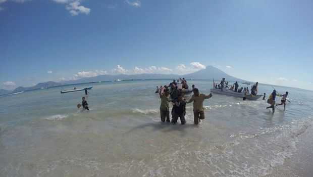 Menteri Susi tiba di Desa Babokerong, Kecamatan Nagawutung, Lembata, NTT, Sabtu (11/6/2016) pukul 09.30 WITA, menggunakan speedboat. Tiga perahu nelayan yang ditumpangi anak-anak desa tampak beratraksi menyambut dengan berputar-putar menggoyang-goyangkan perahu mereka tanpa rasa takut.