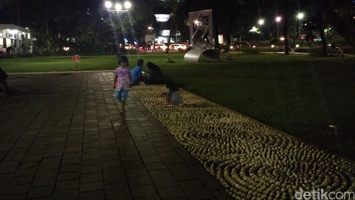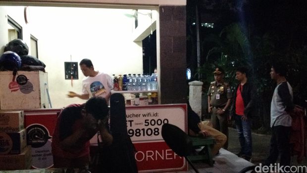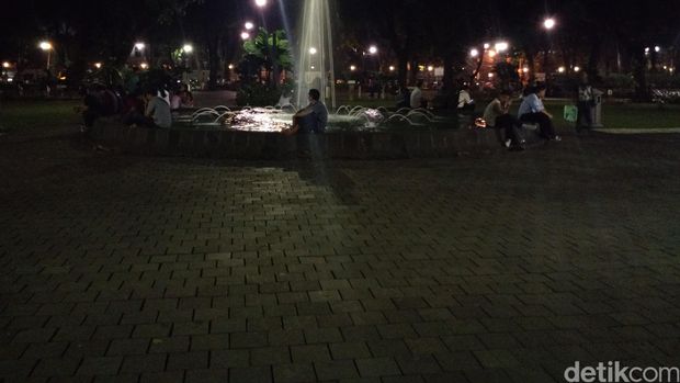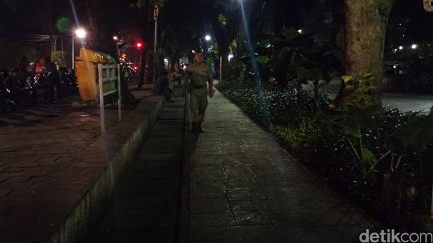 Di bawah temaram lampu taman, seorang aparat Satuan Polisi Pamong Praja (Satpol PP) menebar pandangan ke segala arah. Ternyata bukan hanya satu orang saja personel Satpol PP di sini. Terhitung ada lima orang yang sempat terlihat.