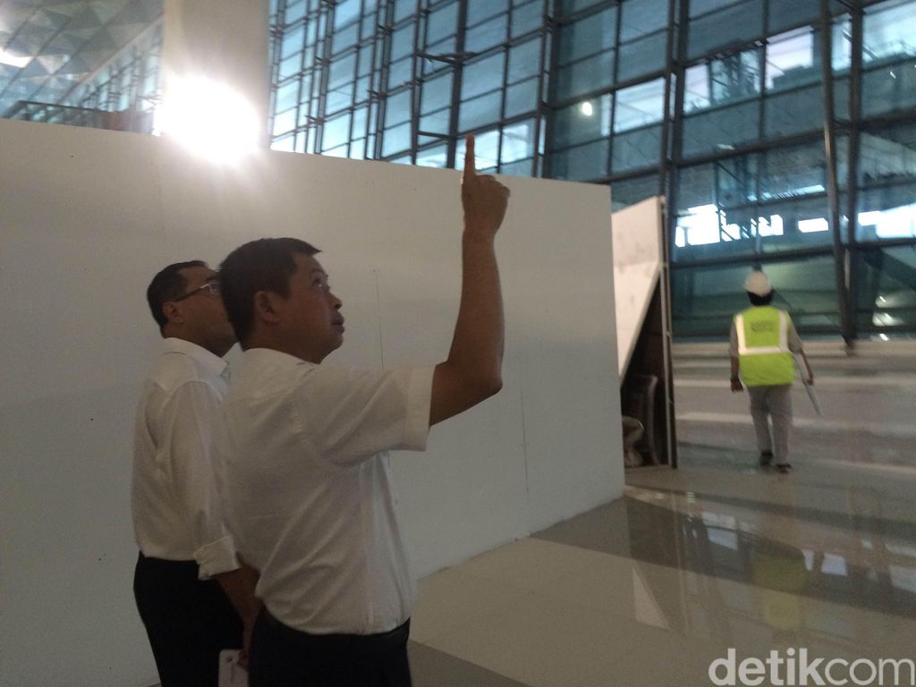 Menhub Jonan menunjuk langit-langit yang menurutnya 'kurang aman' (Foto: Bisma Alief/detikcom)' |