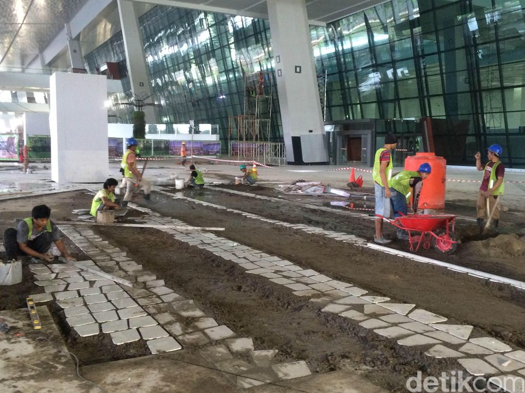 Peninjauan Jonan beranjak ke lantai dasar. Tampak para pekerja bangunan memasang keramik, kaca, hingga membenahi eskalator yang 'masih telanjang' dari samping.