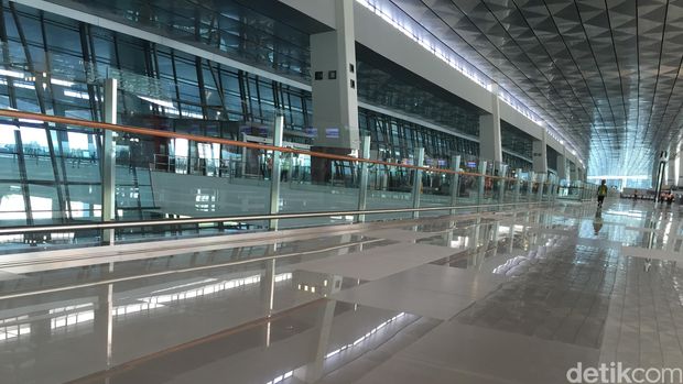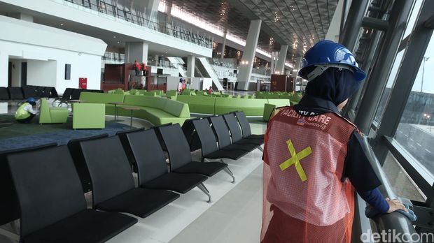 Masuk lebih dalam bandara, pekerja juga sedang membersihkan ruang check in. Beberapa furnitur juga terlihat sedang dirapikan dan difinishing.
