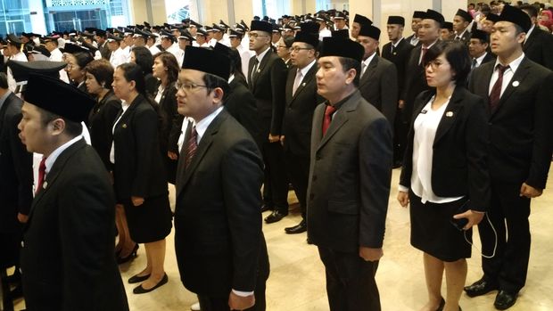 Di barisan belakang, nampak para PNS ditertibkan, dipisahkan antara yang benar-benar akan dilantik dan yang hanya melihat pelantikan saja. Sekitar 300 PNS mengisi ruangan ini membentuk barisan. (dnu/hri)