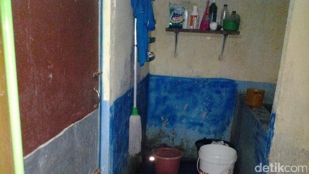 Bak kamar mandi dibuat dari semen, tanpa keramik. Bagian bawah dicat warna biru, sedangkan dindingnya berwarna putih kusam.